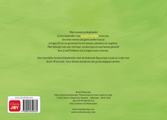 Een heerlijke moestuinkalender met de bekende figuurtjes Luuk en Lotje van Ruth Wielockx. Voor kleine kinderen die grote stappen zetten.