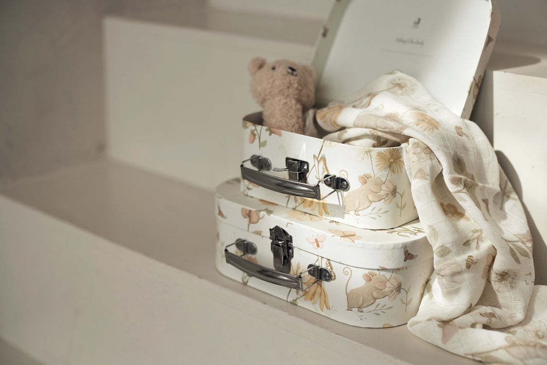 Het koffertje heeft een prachtig printje uit het Dreamy Mouse thema en aan de binnenkant kun je de naam van je kindje schrijven. Is je baby er nog te klein voor? Dat geeft niks! Het koffertje is ook een echte eyecatcher als deco in de babykamer. Tip: geef dit koffertje als kraamcadeau!