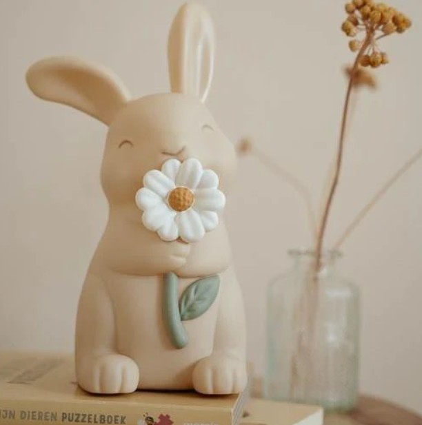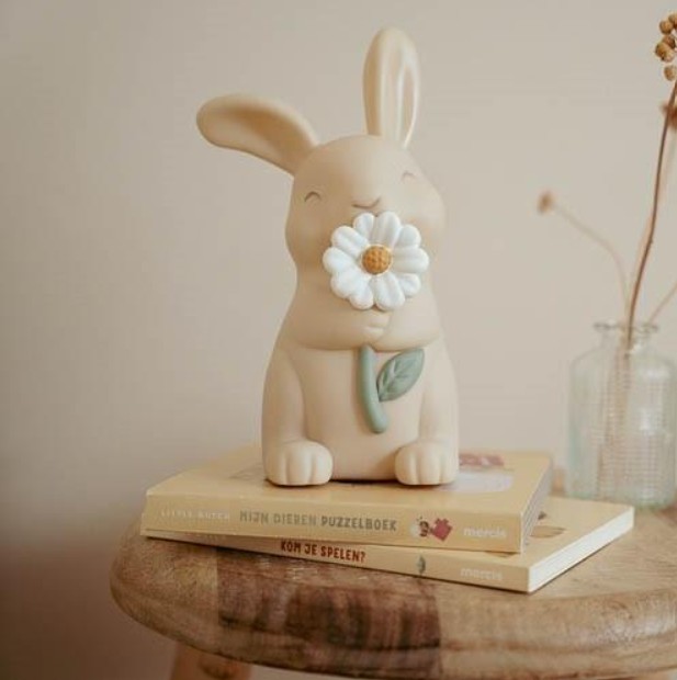 Het is bedtijd! Laat Baby Bunny haar rustgevende lichtje schijnen in de kinderkamer en je kleintje is zo in dromenland. Dit nachtlampje in de vorm van een konijn geeft je kindje het gevoel van veiligheid en comfort om rustig in slaap te vallen. Het draadloze LED-nachtlampje zal met zijn zachte (niet-dimbare) licht en vriendelijke uitstraling geweldig staan in elke kinderkamer. En kan handig zijn om een bedritueel te introduceren. Welterusten! Het lampje gaat automatisch uit na 12 minuten om batterijen te besparen. Drie LR44-knoopcel batterijen inbegrepen.