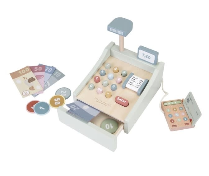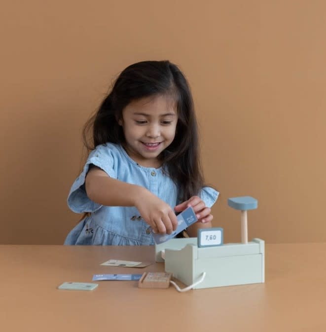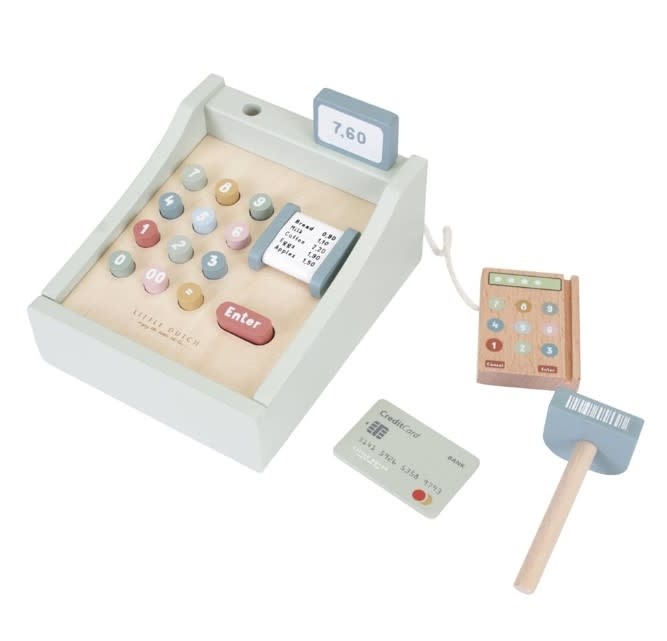 Deze houten kassa heeft zowel een pinautomaat als munten en bankbiljetten die je in de kassalade kunt opbergen. Alles wat je nodig hebt om winkeltje te spelen met je mama en papa, vrienden of favoriete pop. De speelgoedkassa is niet alleen heel leuk voor rollenspel, maar helpt ook om de wiskundige, motorische en sociale vaardigheden van je kindje te ontwikkelen.