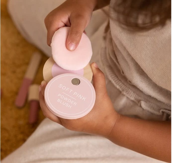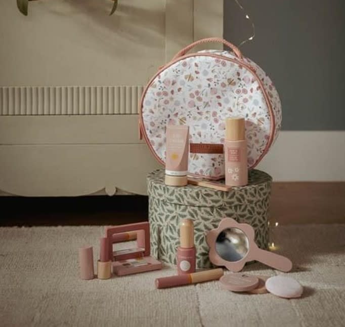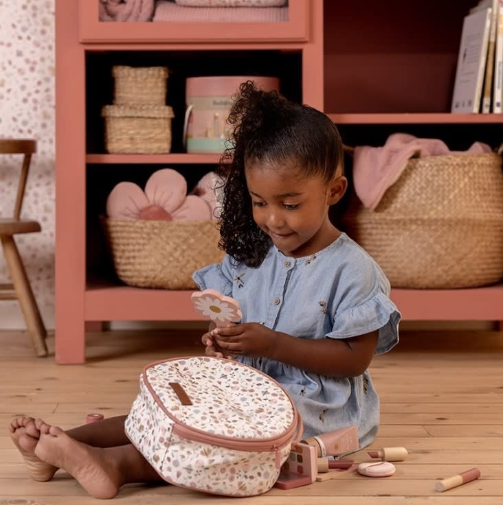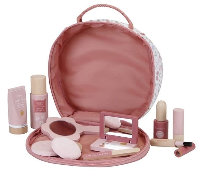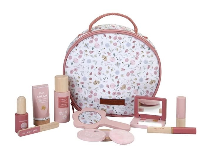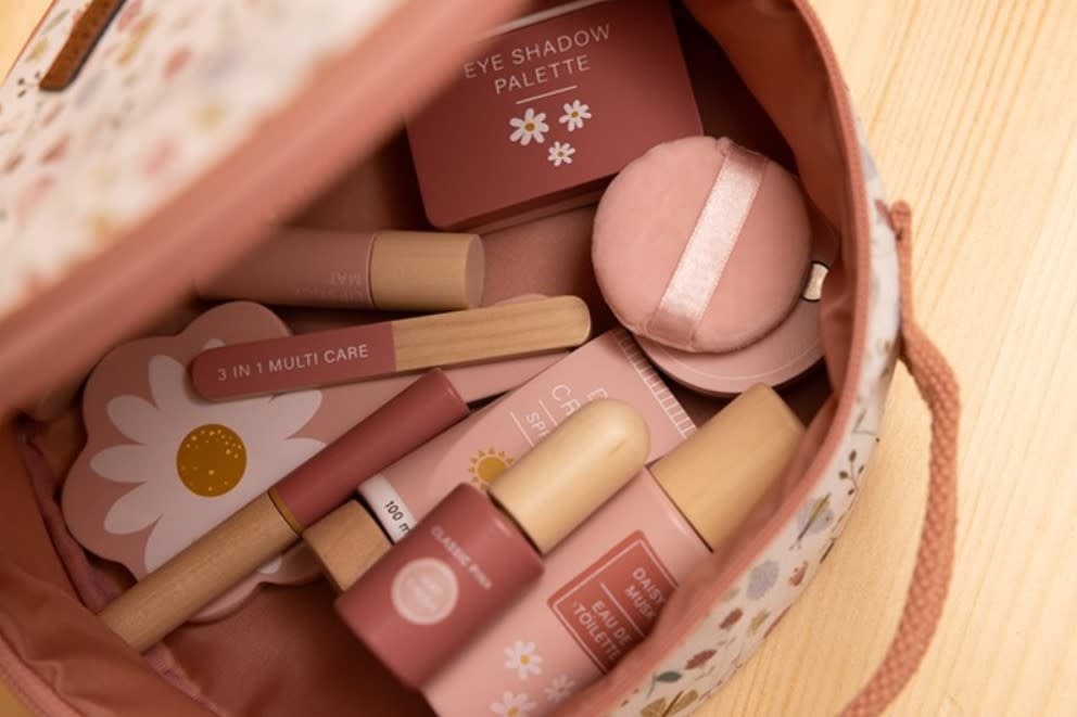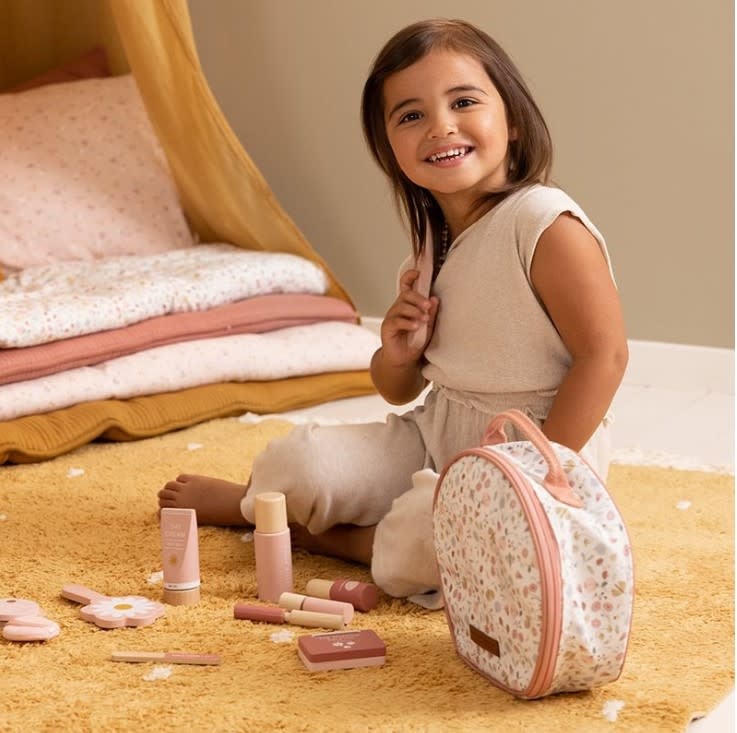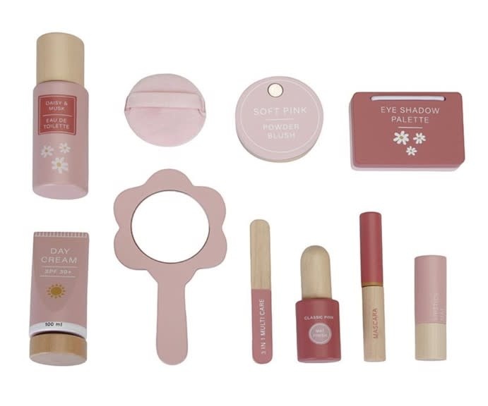 Zo is er een handspiegel, een parfumflesje en een tube crème. De set bestaat daarnaast uit lippenstift, nagellak, gezichtspoeder, poederdonsje, oogschaduw. mascara en een nagelvijl. De beautycase van Little Dutch zorgt voor speelplezier, zonder de rommel van echte make-up! Geschikt vanaf 3 jaar.