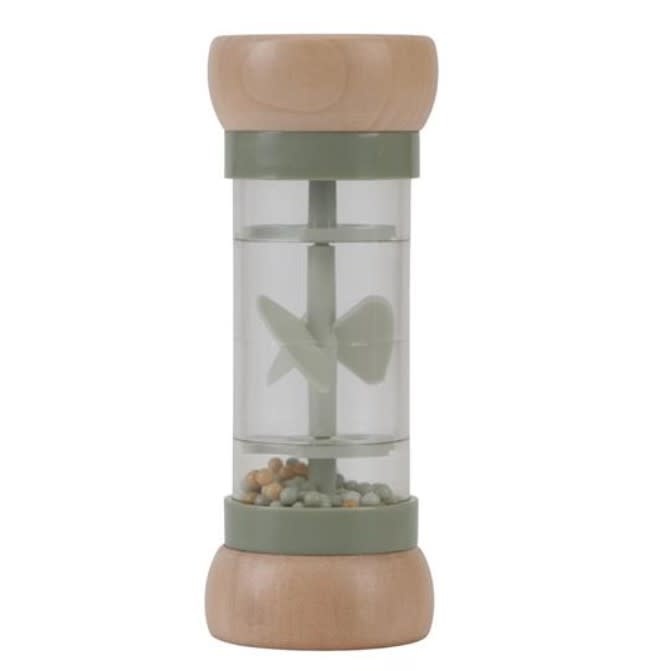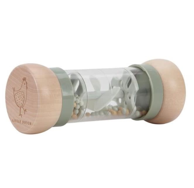 De balletjes, vallen door kleine openingen in de buis en laten de propeller draaien, wat resulteert in een aangenaam geluid. De regenrammelaar is ontworpen voor kleine handjes en ligt lekker in de hand. De houten boven- en onderkant zijn versierd met een tekening van een schaap en een kip en uit de Little Farm collectie.