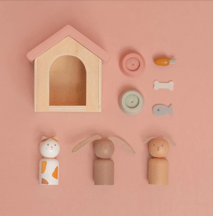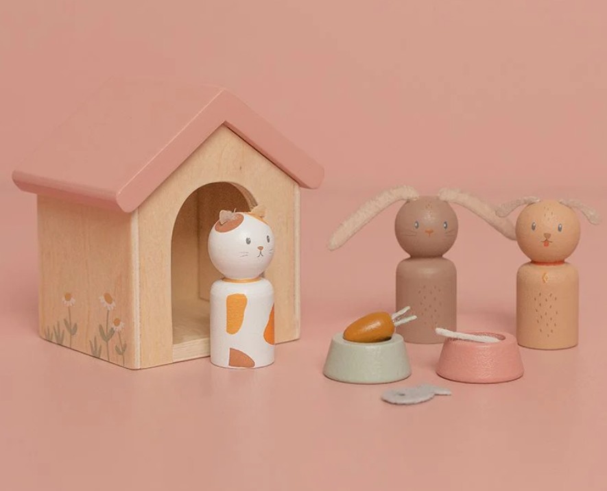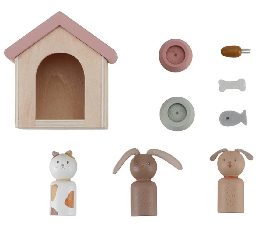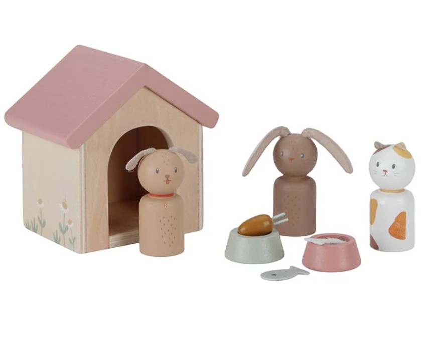 Breng het Little Dutch poppenhuis tot leven met de aanvulset huisdieren! Verwelkom een braaf hondje, een schattig konijntje en een lieve kat in je poppenfamilie. Geef ze een warm mandje, voederbakjes en speeltjes om mee te spelen. Zorg voor onvergetelijke avonturen en knuffelmomenten met deze betoverende huisdieren en hun bijpassende toebehoren. Het poppenhuis wordt een echte beestenboel!