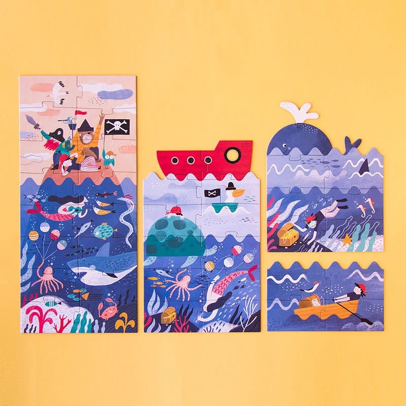 Een set piraten- en schatpuzzels van 4, 8, 12 en 16 stukjes die in lagen zijn opgebouwd, van groot naar klein.