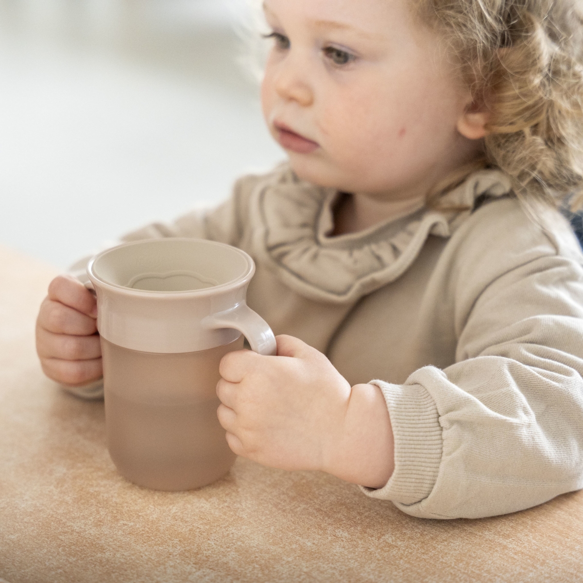 Met zijn 360° drinkrand biedt deze beker een natuurlijke overgang naar het gebruik van een gewone beker, waardoor je kind vanaf de hale rand kan drinken zonder te morsen.