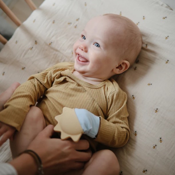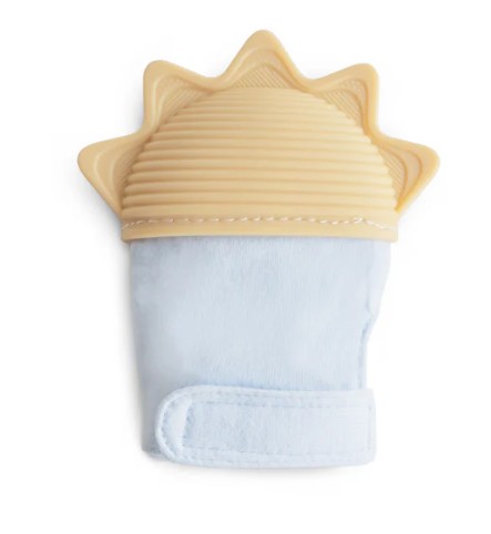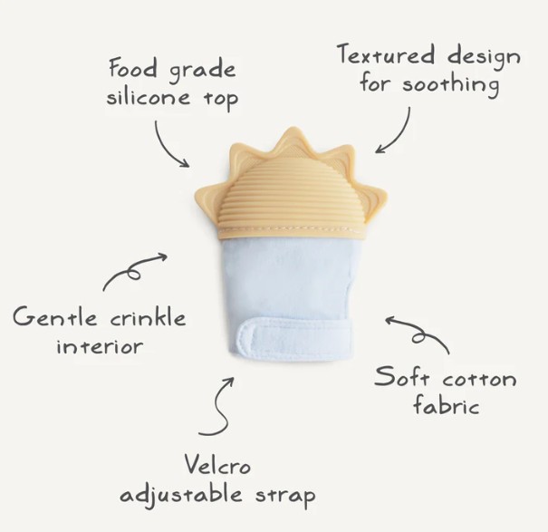 Wanneer kleintjes tandjes beginnen te krijgen en op hun handjes willen bijten, is de Mushie Teething Mitten een perfecte verzachtende oplossing. Een getextureerde siliconen hoes bedekt de vingers en verzacht pijnlijk tandvlees. Het handschoenontwerp en de verstelbare band zijn ideaal voor kleinere baby’s die nog niet goed een bijtring kunnen vastpakken. De zachte katoenen stof beschermt de tere huid van de baby tegen overtollig speeksel. De want schuift gemakkelijk over kleine handjes en kan zowel links als rechts gedragen worden. Een zacht knisperend geluid stimuleert de gehoorzintuigen van de baby en zorgt voor extra comfort. Ontworpen met aantrekkelijke vormen en rustgevende kleuren.
