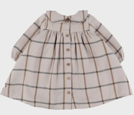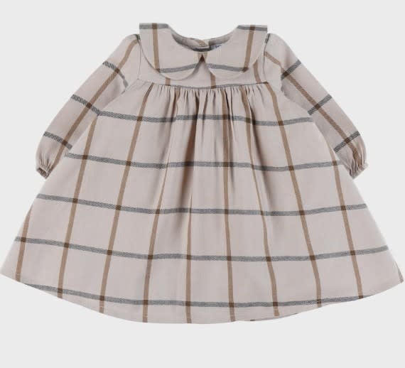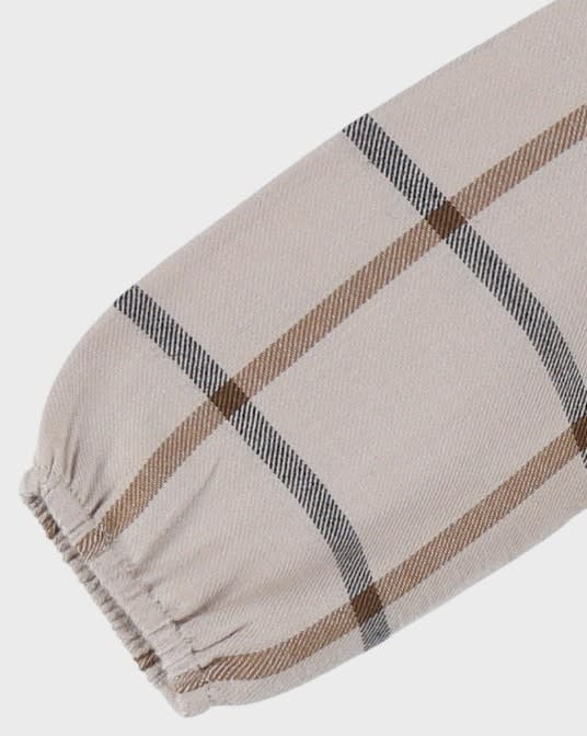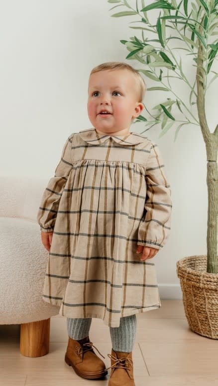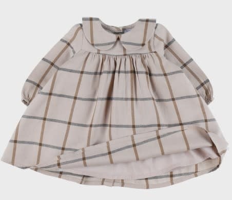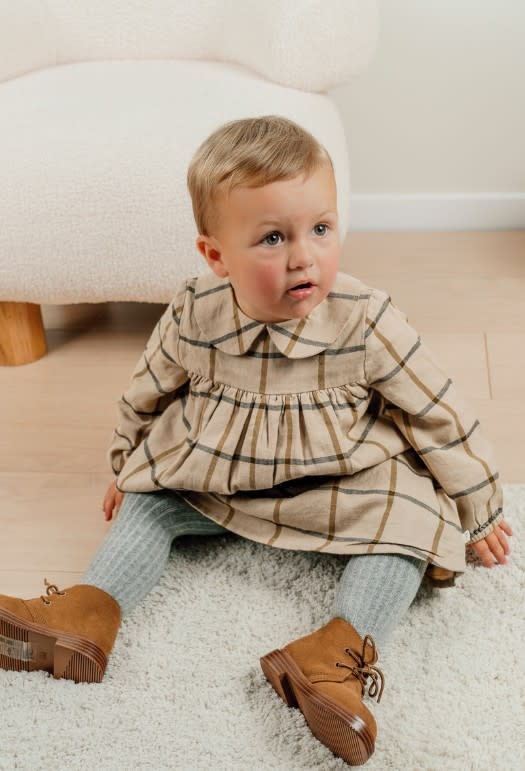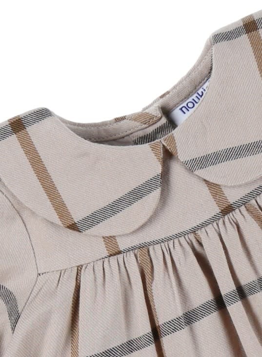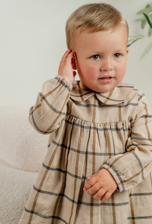 Een prachtig beige geruite jurk, gemaakt van zachte katoen voor comfort en lichtheid voor je baby. De platte kraag en de geplooide pofmouwen geven een elegante toets. Met de soepele snit en de geplooide taille is ze perfect voor elke gelegenheid.