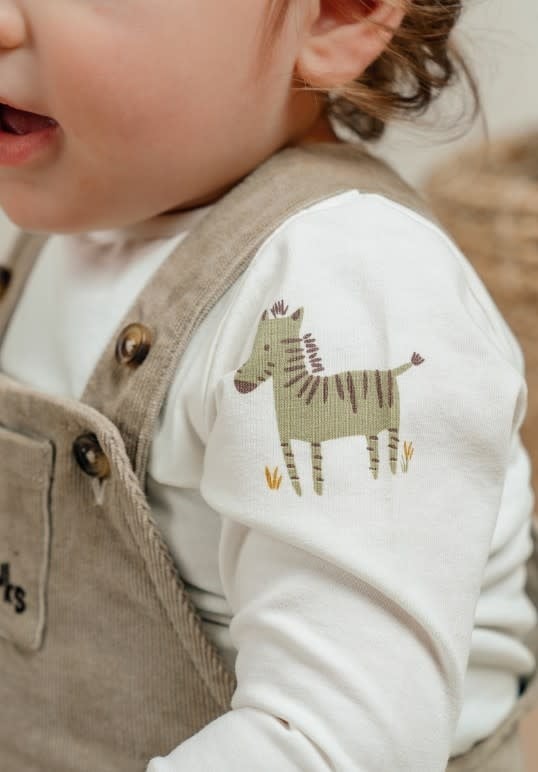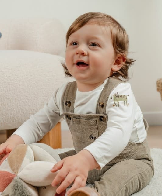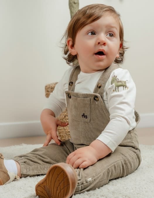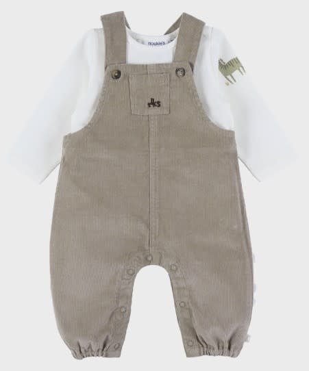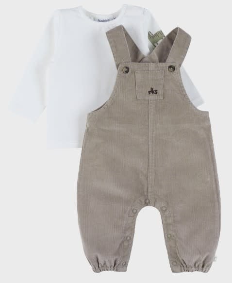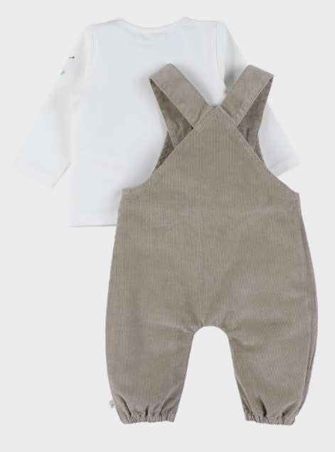 Deze set combineert warmte en originaliteit. Hij bestaat uit een ribfluwelen tuinbroek, zacht en comfortabel, en een katoenen T-shirt met lange mouwen. Een complete look, ideaal voor herfst- en winterdagen.