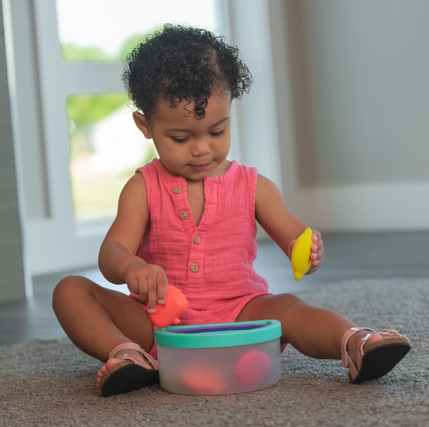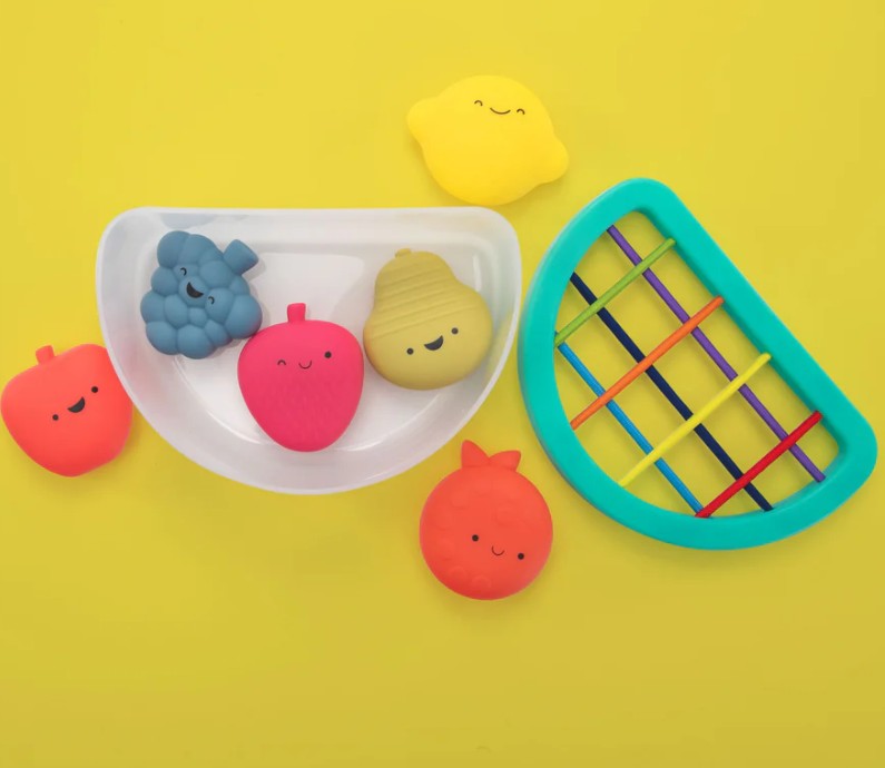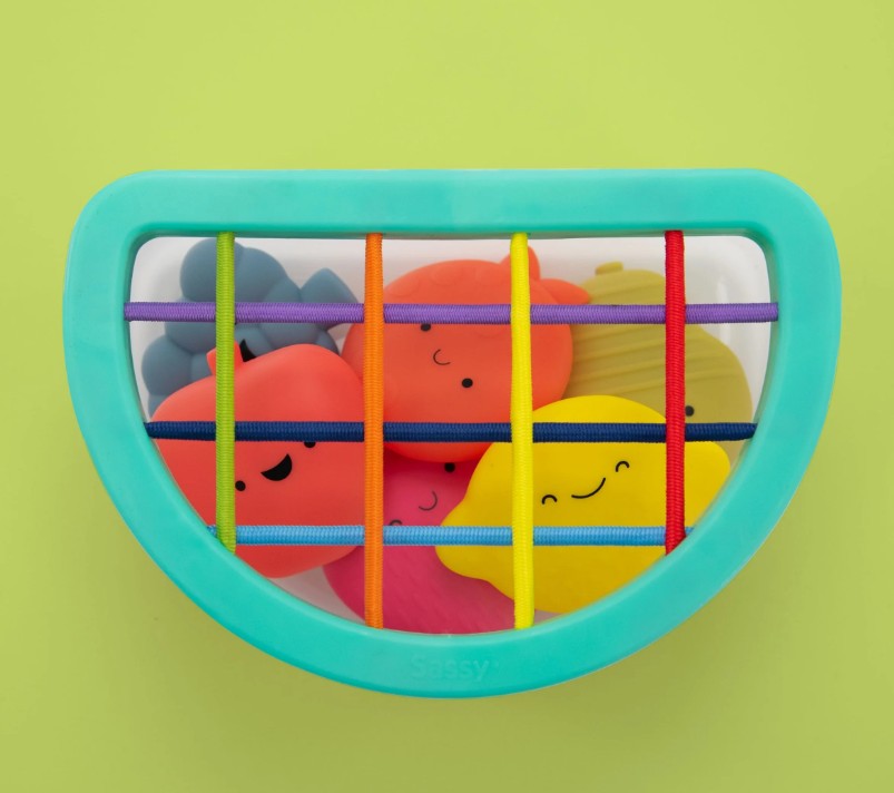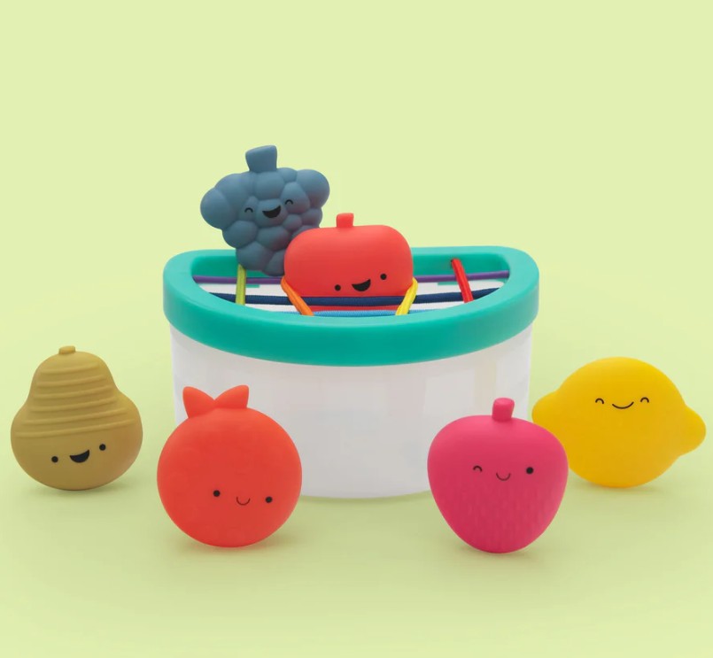 Leer de vorm en kleur van elk fruitje kennen. Vullen en morsen is een ontwikkelingsgerichte activiteit voor baby’s om de fijne motoriek te oefenen. Naarmate de baby groeit, gebruik je het deksel om de baby uit te dagen de vruchten door de elastiekjes te duwen. De vruchten hebben een textuur en zijn zacht, zodat de baby ze in zijn mond kan nemen en kan ontdekken voor de tastzin.