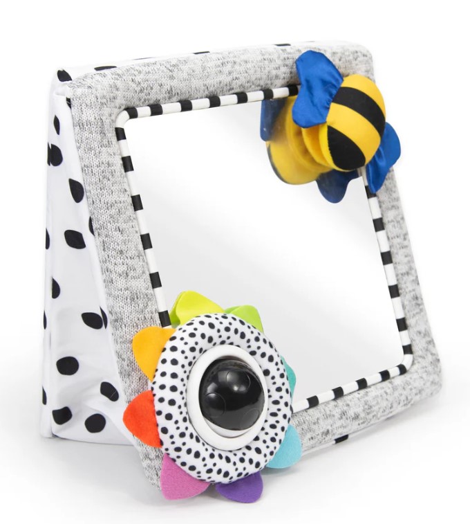 Deze kindveilige spiegel stimuleert je baby om het menselijk gezicht te leren kennen. Het bijtje knispert en stimuleert zo de tastzin. De trackerbal met hoog contrast helpt bij de ontwikkeling van de visuele waarneming van je baby. Het zachte frame van de spiegel is perfect voor de omgeving van je baby en de achterkant van de spiegel zorgt ervoor dat de spiegel op een vlakke ondergrond kan staan.