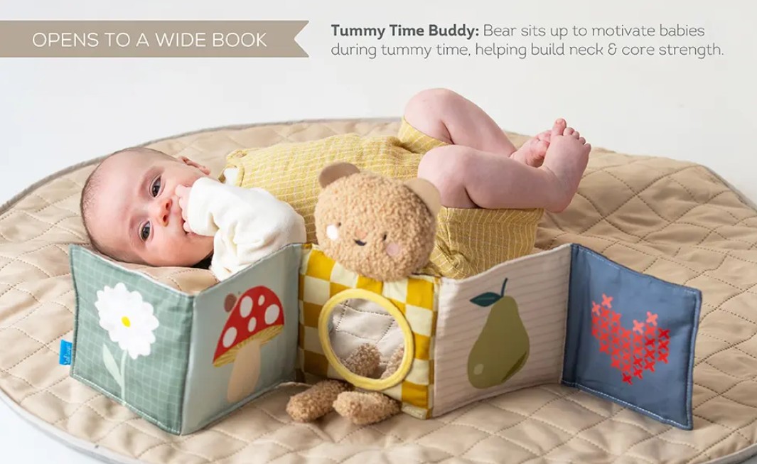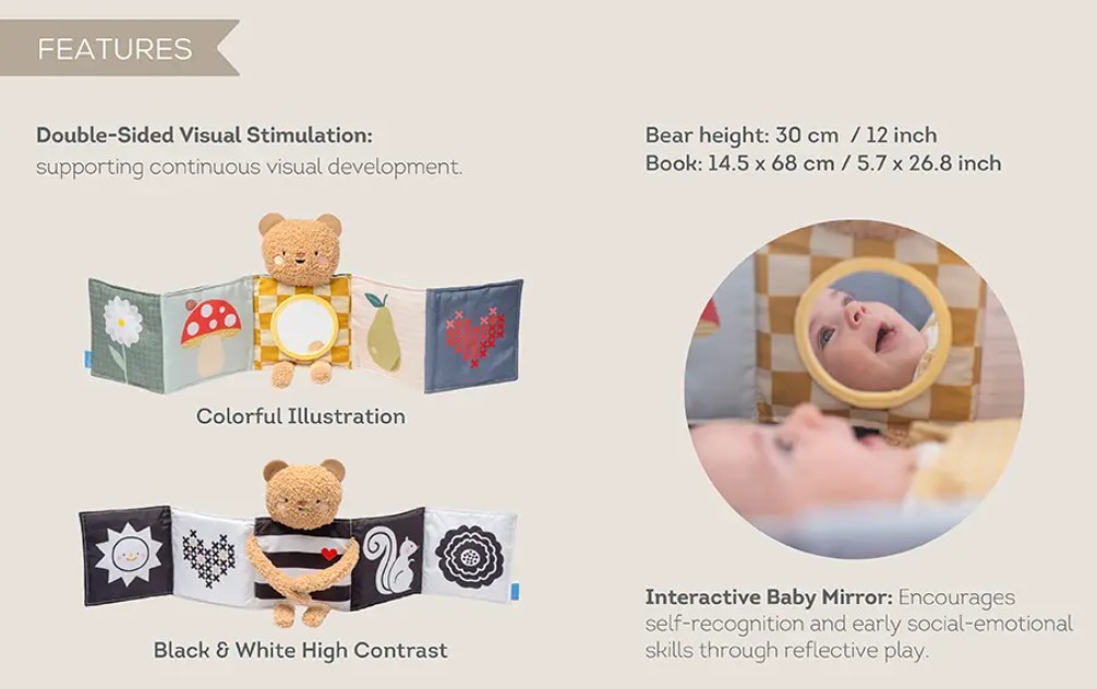 Het Snuggle Bear Book is een dubbelzijdig sensorisch boek voor pasgeborenen. Dit opvouwbare boek bevat een ingebouwde, zachte pluchen beer om te knuffelen, heeft een contrastrijke (zwart-witte) kant voor pasgeborenen en een kant met levendige kleuren voor visuele stimulatie. Een babyspiegel zorgt voor interactief plezier, terwijl de beer een vriendje wordt voor tijdens het buikliggen of gezelschap voor onderweg. Perfect om mee te knuffelen en te spelen!