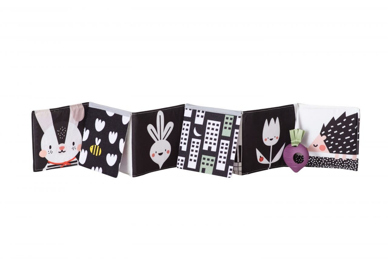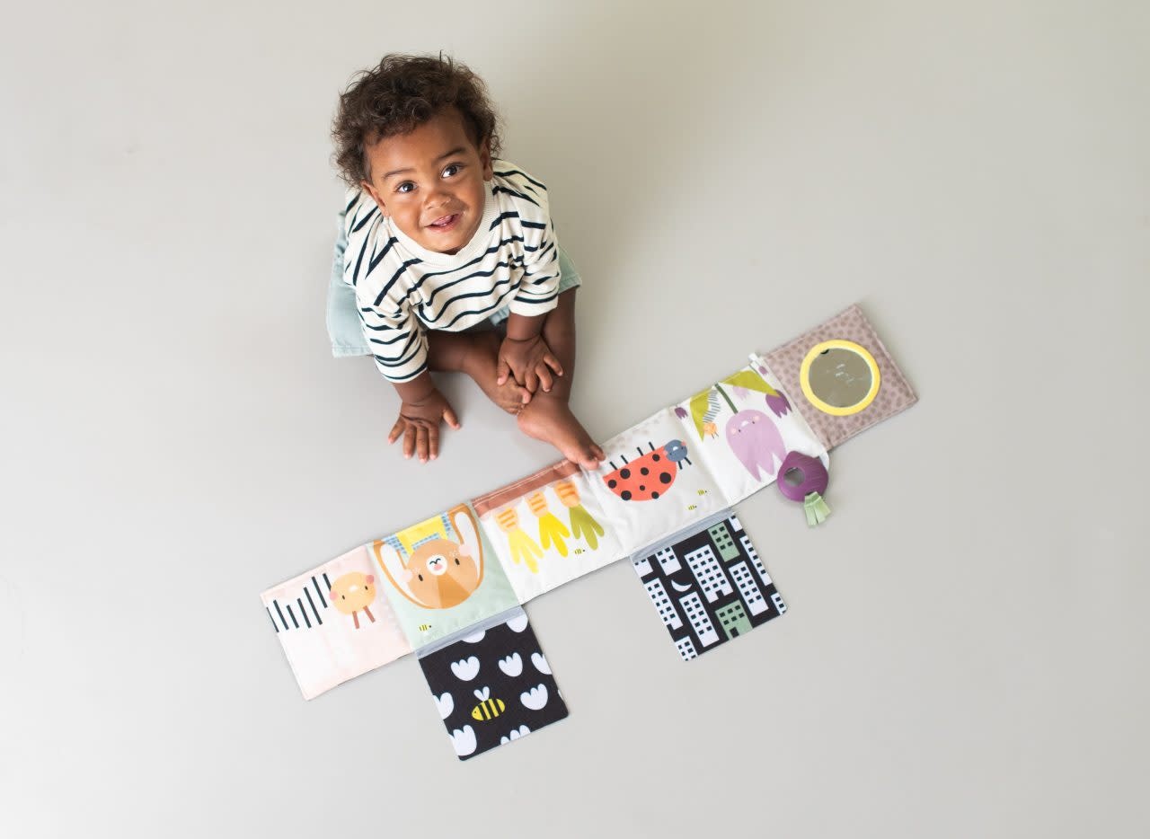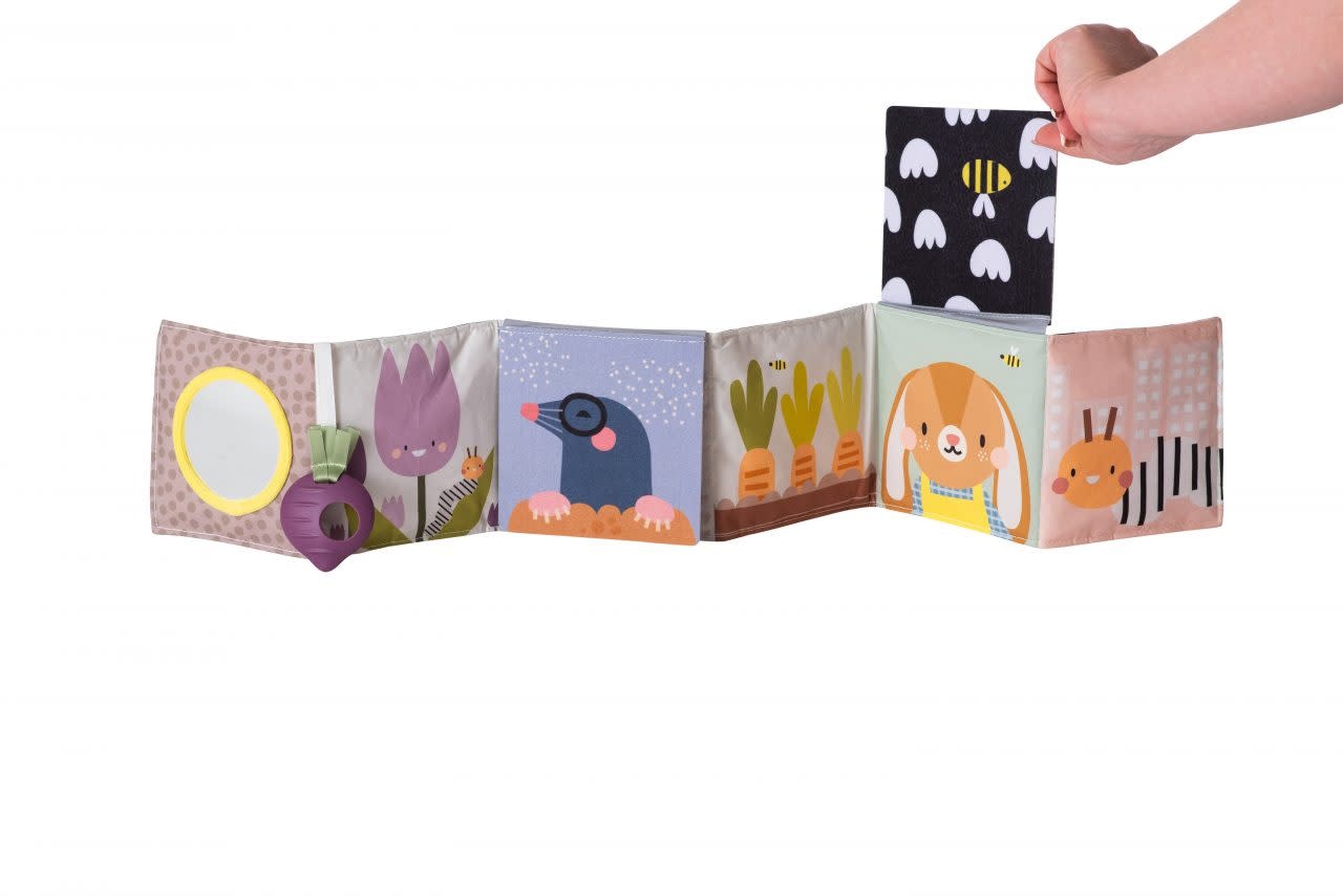 De andere kant bestaat uit kleurrijke, complexere illustraties en patronen, een babyveilige spiegel en een bietenbijtring om baby’s fijne motoriek te helpen ontwikkelen.