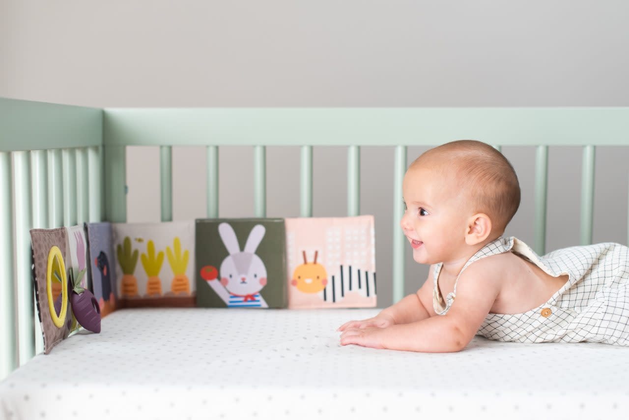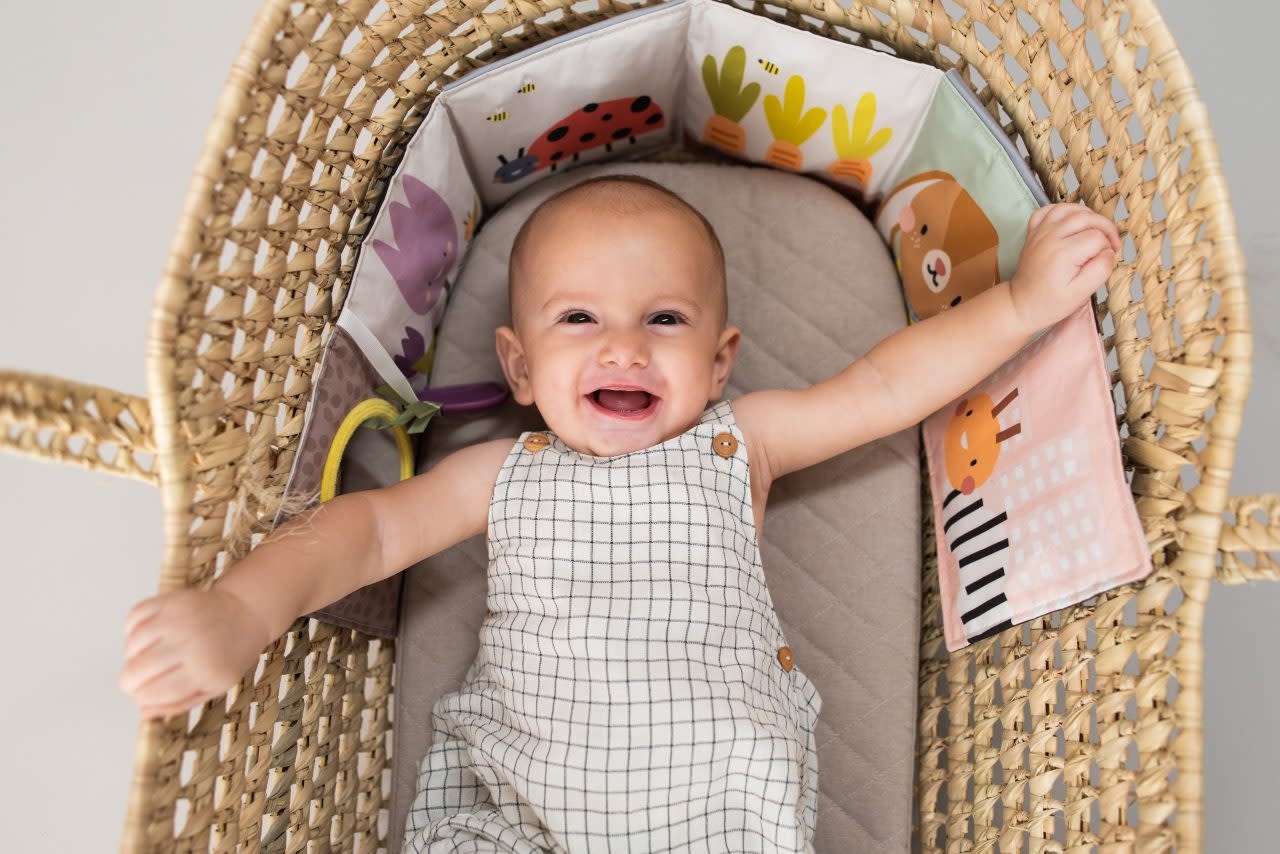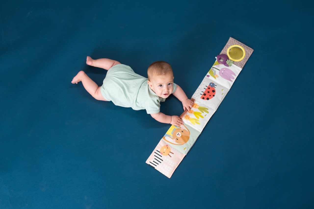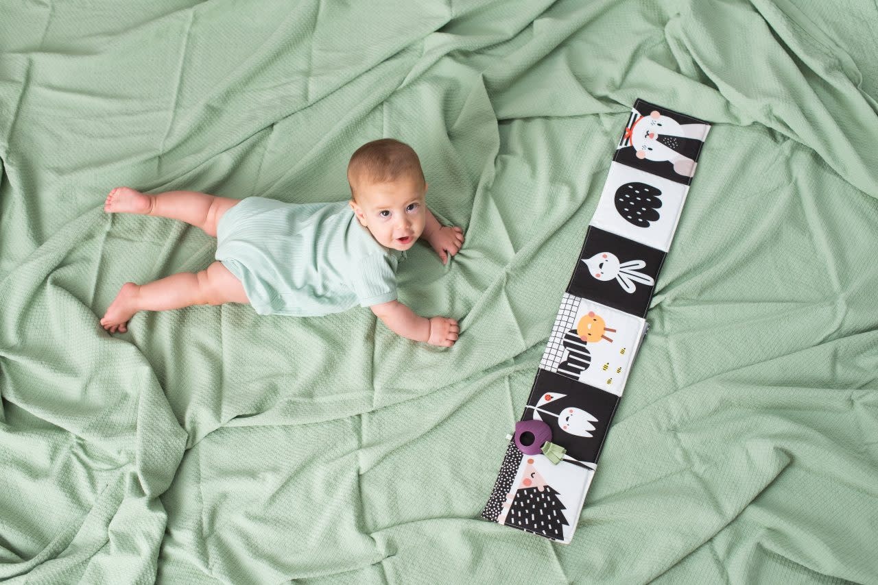 De andere kant bestaat uit kleurrijke, complexere illustraties en patronen, een babyveilige spiegel en een bietenbijtring om baby’s fijne motoriek te helpen ontwikkelen.