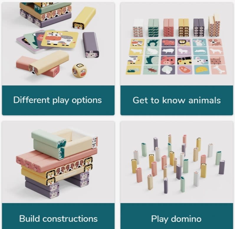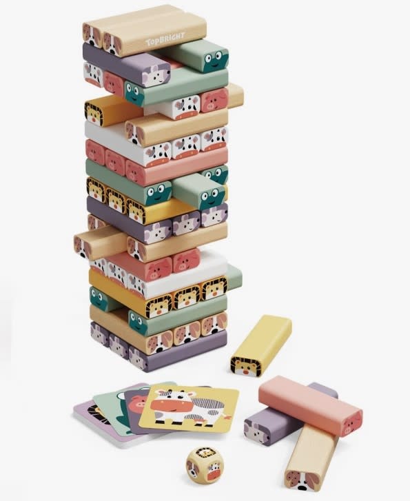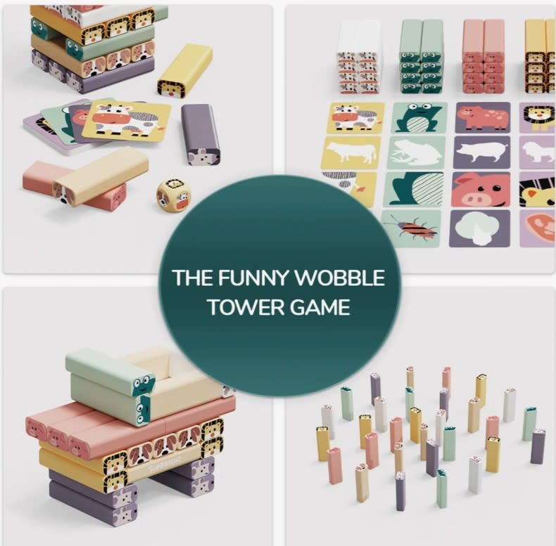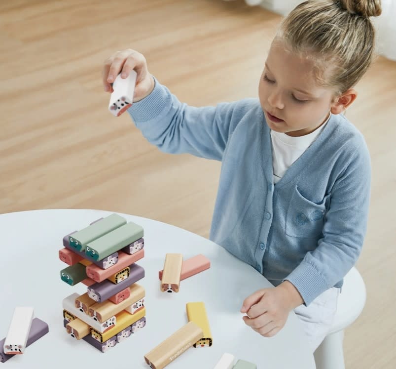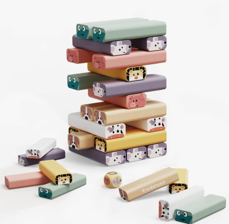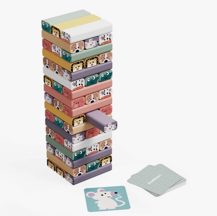Samen met vrienden en familie bouwen kinderen een hoge toren. Hiervoor plaatsen ze de kleurrijke houten blokken met schattige dierenprints op elkaar. En dan begint het plezier! Om de beurt gooien ze met de dobbelsteen of trekken ze één voor één een kaartje. “Welk dier zie je? – Een hond!” Daarna trekken ze voorzichtig het bijpassende houten blokje met het aangegeven dier uit de toren en leggen het erop. Maar pas op! Als de toren instort, is het spel afgelopen en begint het weer opnieuw.